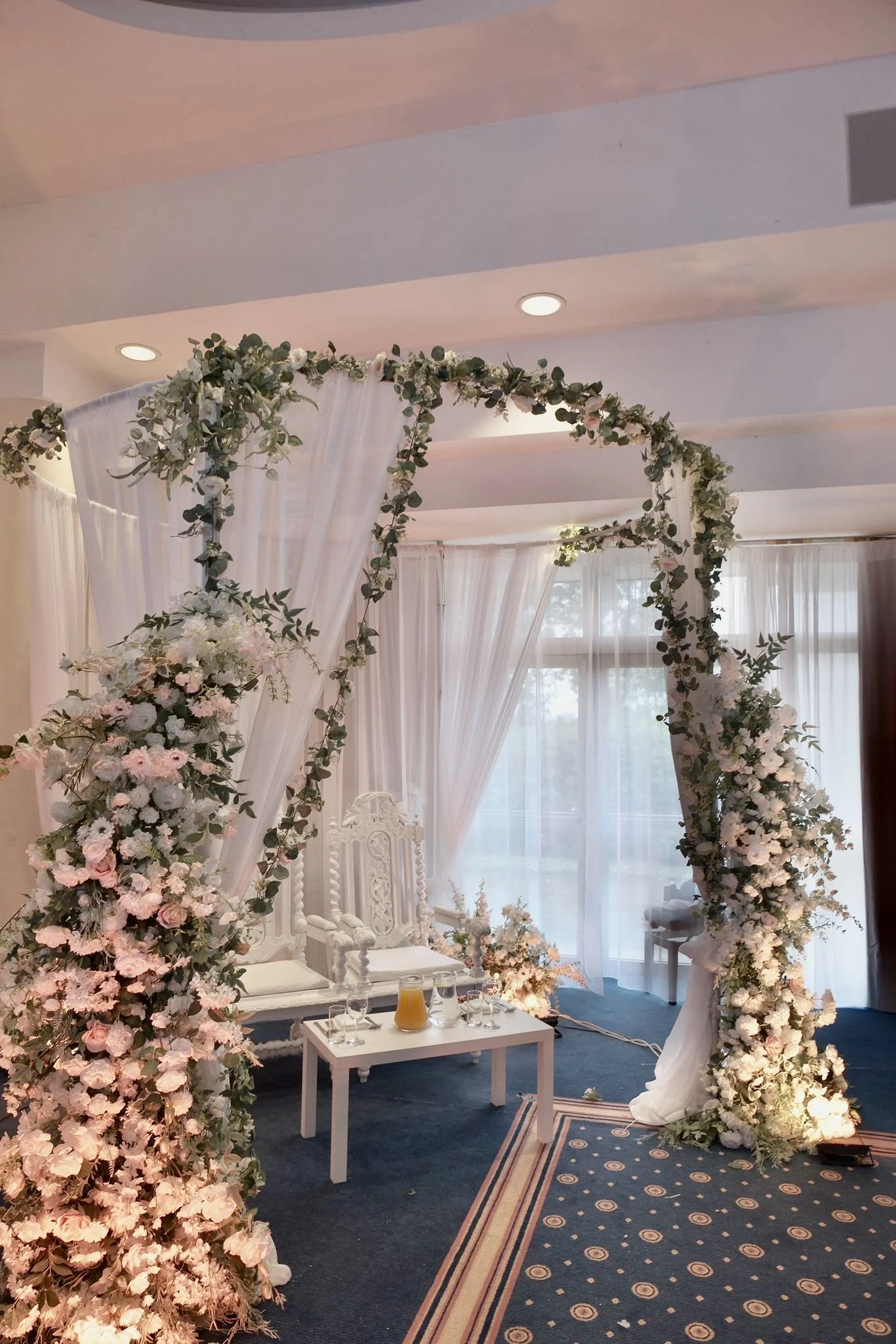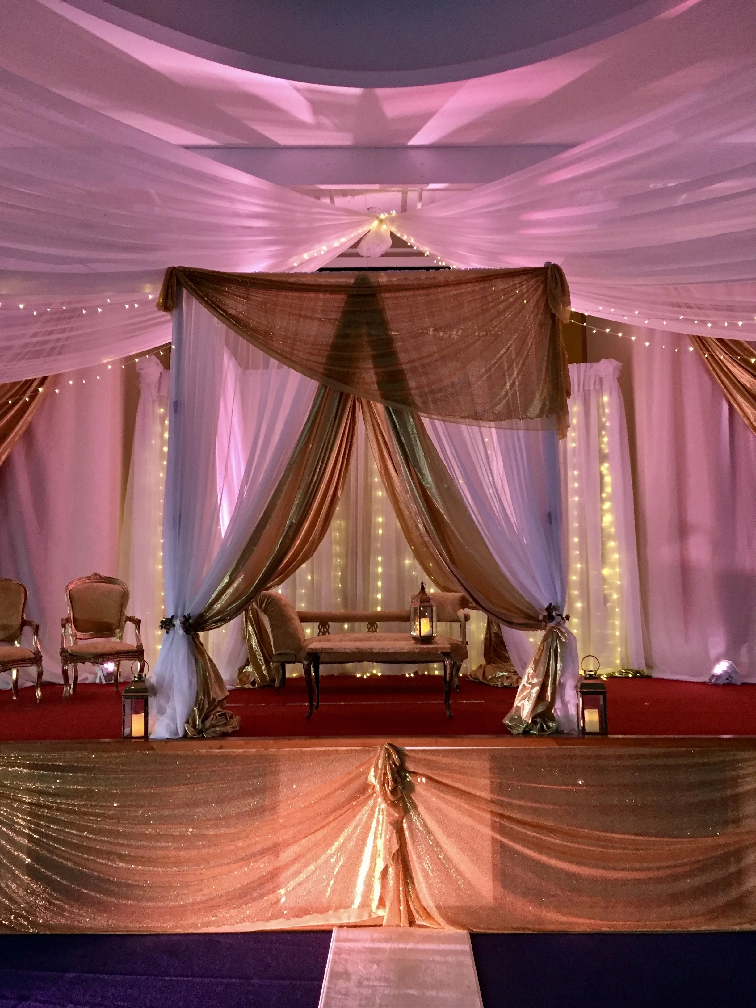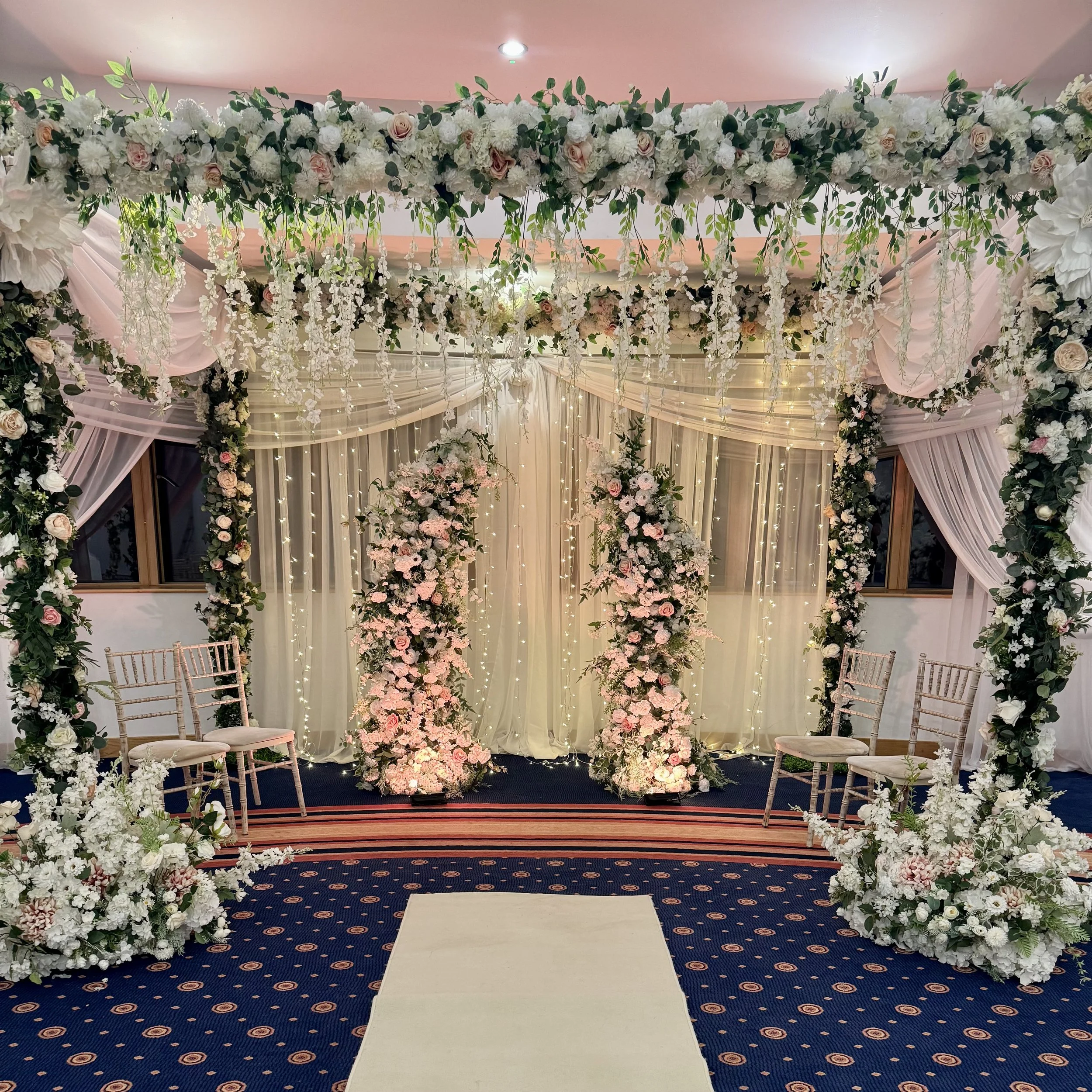 These are some of the larger weddings and venues. Some are even in sports halls to cater to large numbers of guests. We have Mandap round and square frames, layered back drops, coloured silks and lots of florals.